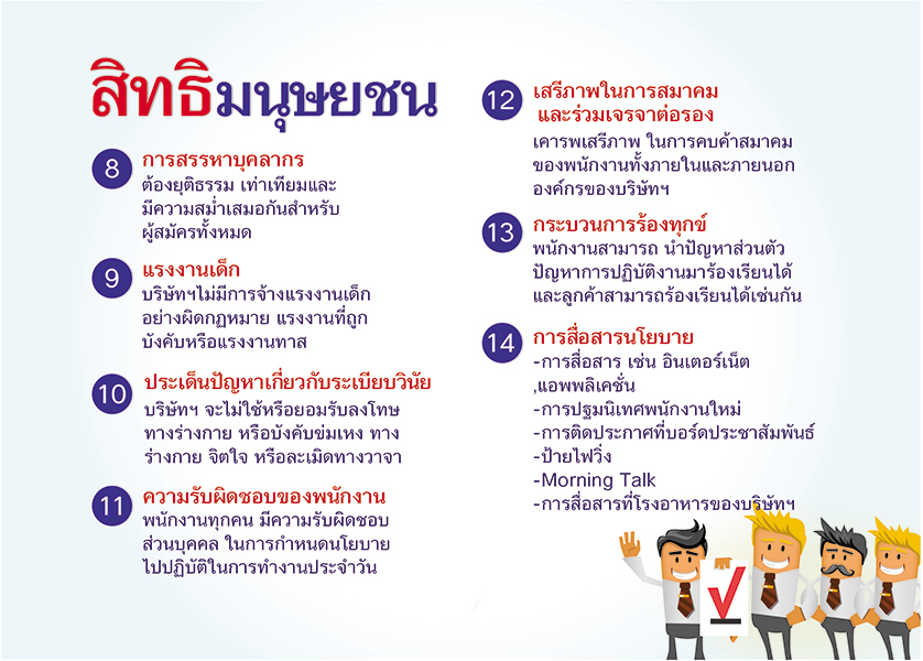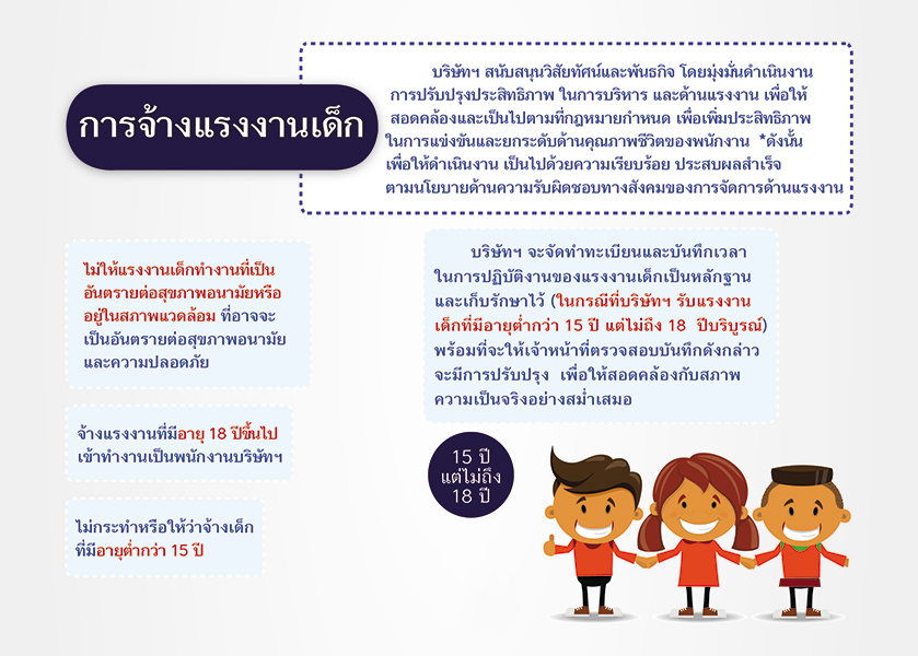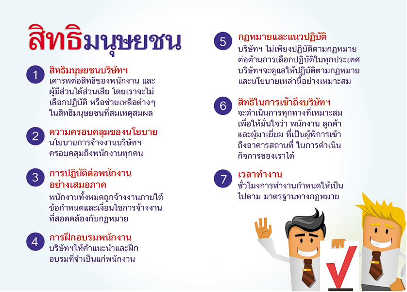 สิทธิมนุษยชน และการปฏิบัติต่อแรงงาน โดยบริษัทฯ คาดหวังให้ผู้ค้า เคารพในสิทธิตามกฎหมายของลูกจ้าง ทั้งทางด้านชั่วโมงการทำงาน ค่าตอบแทน และผลประโยชน์ การเลิกจ้าง รวมถึงการรับข้อร้องเรียน และการส่งเสริมแรงงานสัมพันธ์ ให้เป็นไปตามกฎหมาย มีการปฏิบัติอย่างเท่าเทียม ไม่เลือกปฏิบัติต่อความแตกต่าง ในการจ้างงาน และปฏิบัติงาน และไม่สนับสนุนการใช้แรงงานเด็ก โดยกำหนดอายุขั้นต่ำของแรงงาน ต้องมีอายุต่ำกว่า 15 ปี ความรับผิดชอบต่อสังคม บริษัทฯ คาดหวังให้ผู้ค้า ปฏิบัติงานโดยไม่สร้างความเดือดร้อนรำคาญให้กับชุมชนโดยรอบ ในขณะเดียวกันอาจจะร่วมกิจกรรมช่วยเหลือสังคมตามกำลัง