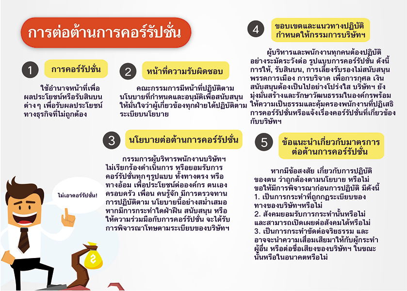 จริยธรรมทางธุรกิจ และความโปร่งใสในการดำเนินธุรกิจ โดยบริษัทฯ คาดหวังให้ผู้ค้า และผู้รับเหมา ปฏิบัติอย่างเป็นธรรม ซื่อสัตย์สุจริต ไม่ยุ่งเกี่ยวกับการคอร์รัปชั่น หรือติดสินบน รักษาความลับของข้อมูล ที่ได้ทำข้อตกลงกับทางบริษัทฯ ไม่ว่าจะเป็นข้อมูลทางด้านการเงิน หรือสิ่งที่เป็นทรัพย์สินทางปัญญา หากทางบริษัทฯ ทราบว่ามีการกระทำความผิด อาจดำเนินการเลิกสัญญา หรือดำเนินการตามกฎหมายได้ โดยบริษัทฯ คาดหวังให้ผู้ค้า และผู้รับเหมา ส่งมอบผลิตภัณฑ์ หรือบริการได้ตามกำหนด พัฒนาคุณภาพของผลิตภัณฑ์อย่างต่อเนื่อง โดยนำเทคโนโลยี และนวัตกรรมต่าง ๆ เพื่อประโยชน์กับทางบริษัท และผู้ค้าปฏิบัติตามกฎหมาย โดยบริษัทคาดหวังให้ผู้ค้า และผู้รับเหมา ปฏิบัติตามกฎหมาย หรือข้อบังคับ รวมถึงวิธีการปฏิบัติ และข้อบังคับ ทั้งระดับประเทศ และท้องถิ่นความต่อเนื่องทางธุรกิจ โดยบริษัทฯ คาดหวังให้ผู้ค้า และผู้รับเหมา มีแผนความต่อเนื่องทางธุรกิจ ในกรณีที่ต้องการผลิตภัณฑ์เพิ่มขึ้น หรือกรณีที่ผู้ค้าเกิดการชะงักของธุรกิจ