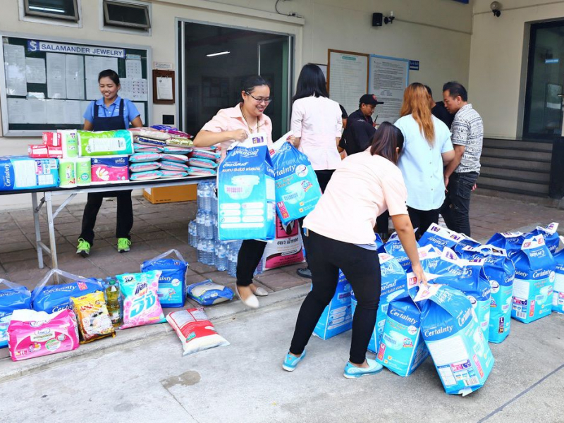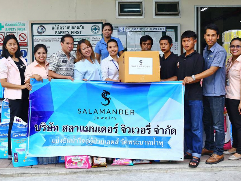 บริษัท สลาแมนเดอร์ จิวเวอรี่ จำกัด ร่วมแบ่งปันน้ำใจ เพื่อเด็กผู้ติดเชื้อ และผู้ป่วยเอดส์ มูลนิธิธรรมรักษ์ วัดพระบาทน้ำพุ เมื่อวันที่ 25 พฤษภาคม 2561 บริเวณหน้าบริษัทฯ